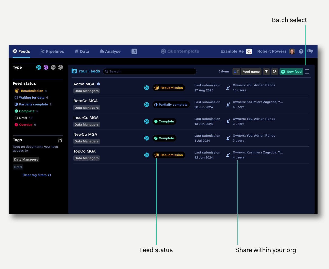 Feeds are created and organised in the feeds repo. The feeds repo acts as a dashboard to summarise the status of your inventory and in future will alert you to Feeds with overdue submissions.