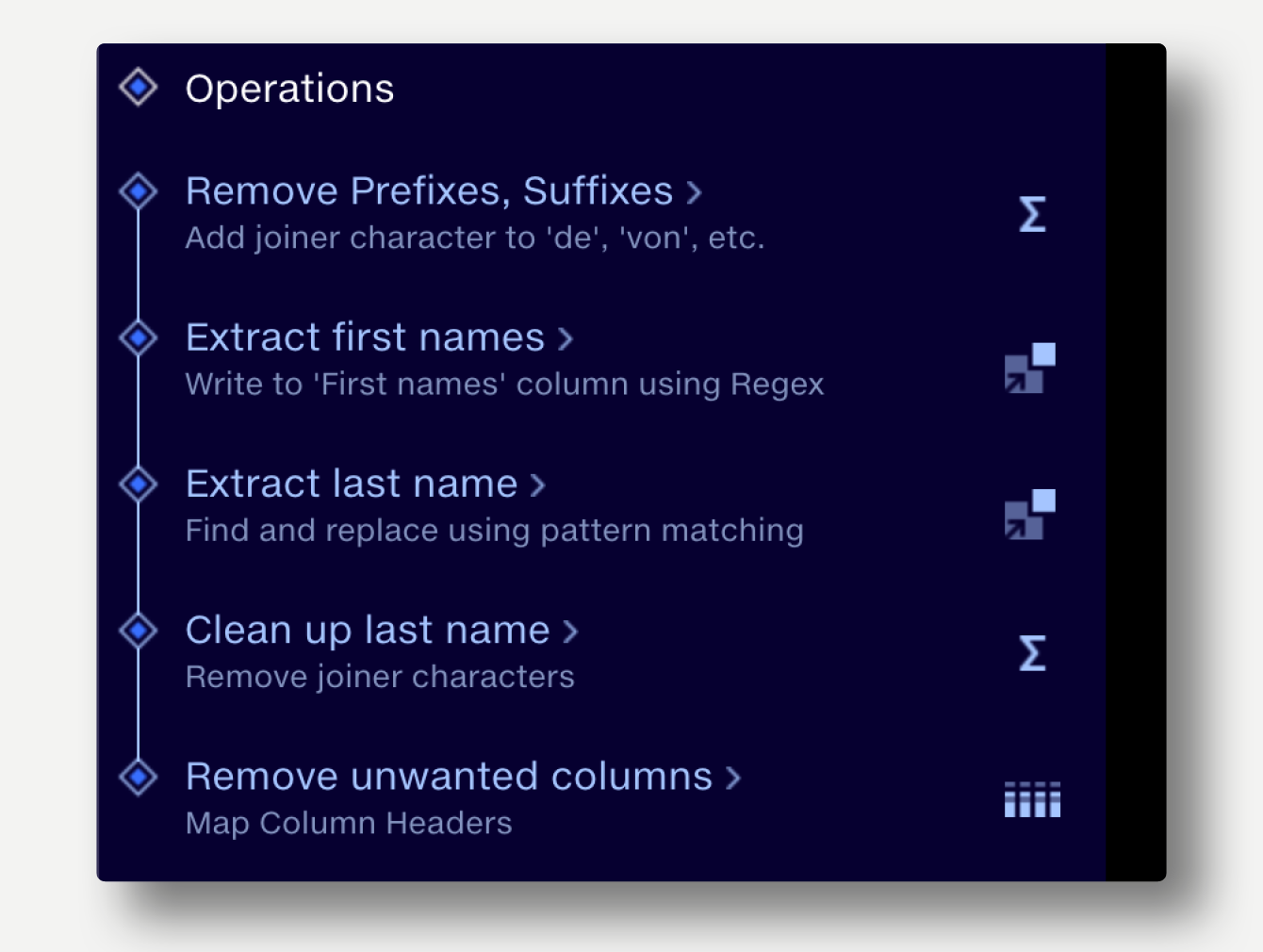 Scenario: you have names of people in a single column. The names need to be cleansed to remove Mr, Mrs, etc and split into a two columns of Last Name and First Name.