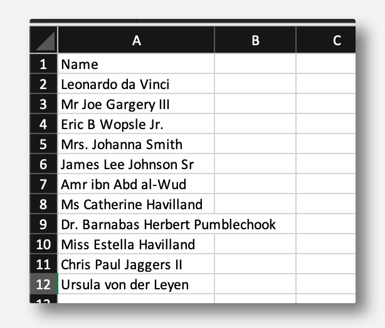 Split into columns for first names and last name. The first names column also includes any middle names submitted. The process could be adapted to split these into a separate column if needed.